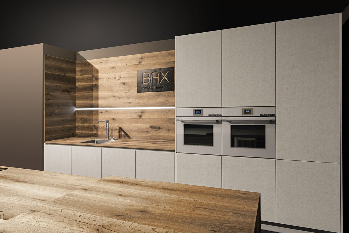 Material: D.95.007 Nero , D.95.009 Tan , D.96.002 - Out of the box - Driftwood - Eiche geplankt , D.96.001 - Out of the box - Chimney - Eiche geplankt Einsatz: Küchenmöbel Architekt/Designer: BAX Küchenmanufaktur